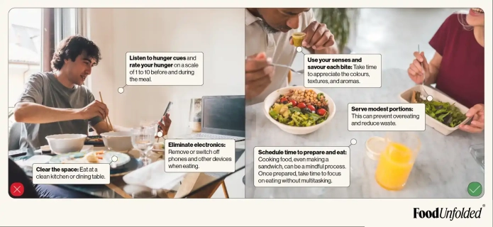 Unlike diets, mindful eating doesn’t involve restrictions or rules. It’s about listening to your body’s hunger and fullness cues, creating a healthy and guilt-free relationship with food.